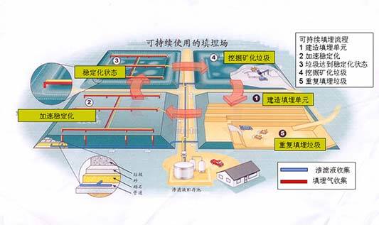 可持续填埋技术使填埋场永续使用。传统填埋工艺垃圾稳定化降解时间长,要达到稳定化状态需30-50年,土地利用率极低。针对以上问题,京环科技采用以陈腐垃圾开采利用为手段、以废物减量化和资源化及土地资源循环利用为目标的生活垃圾可持续填埋工艺来解决问题,工艺过程主要为“分区分单元构建—加速稳定化—开采—筛分再利用—再填埋”五个工艺段。基于生物反应器填埋技术,加速垃圾堆体的稳定化进程,使垃圾快速稳定化后对进行开采分选利用,严格控制过程中的二次污染问题,垃圾开挖后再利用,腾退库容,用于填埋新的垃圾。
