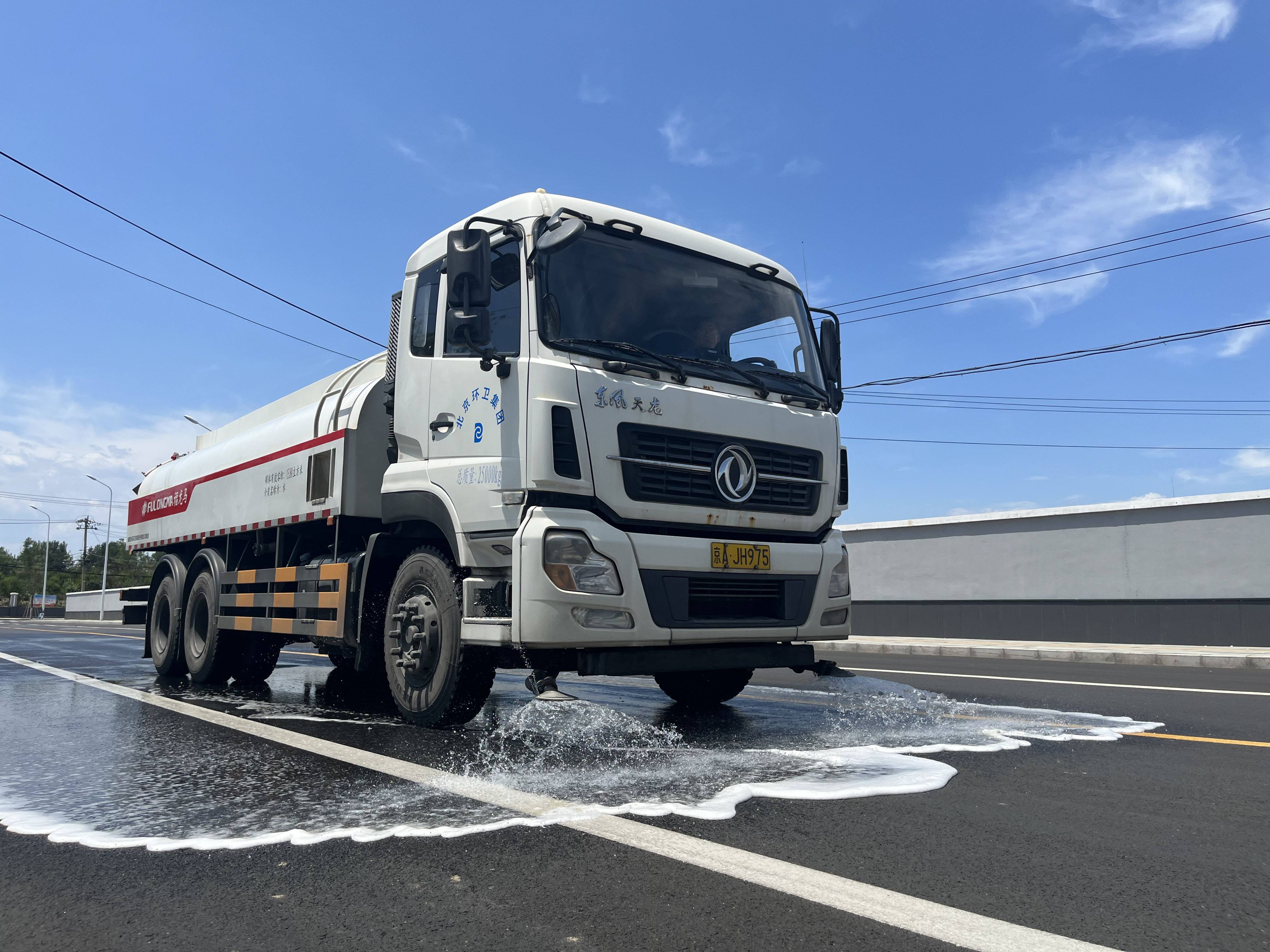 “力尽不知热,但惜夏日长”。正午时分,天似蒸笼,地表温度逼近50℃,第三作业中心机扫司机张宝民驾驶着洒水车从回龙观东大街缓缓驶来,车辆喷洒的扇形水幕形成七彩光幕,为行人送来了阵阵清凉。