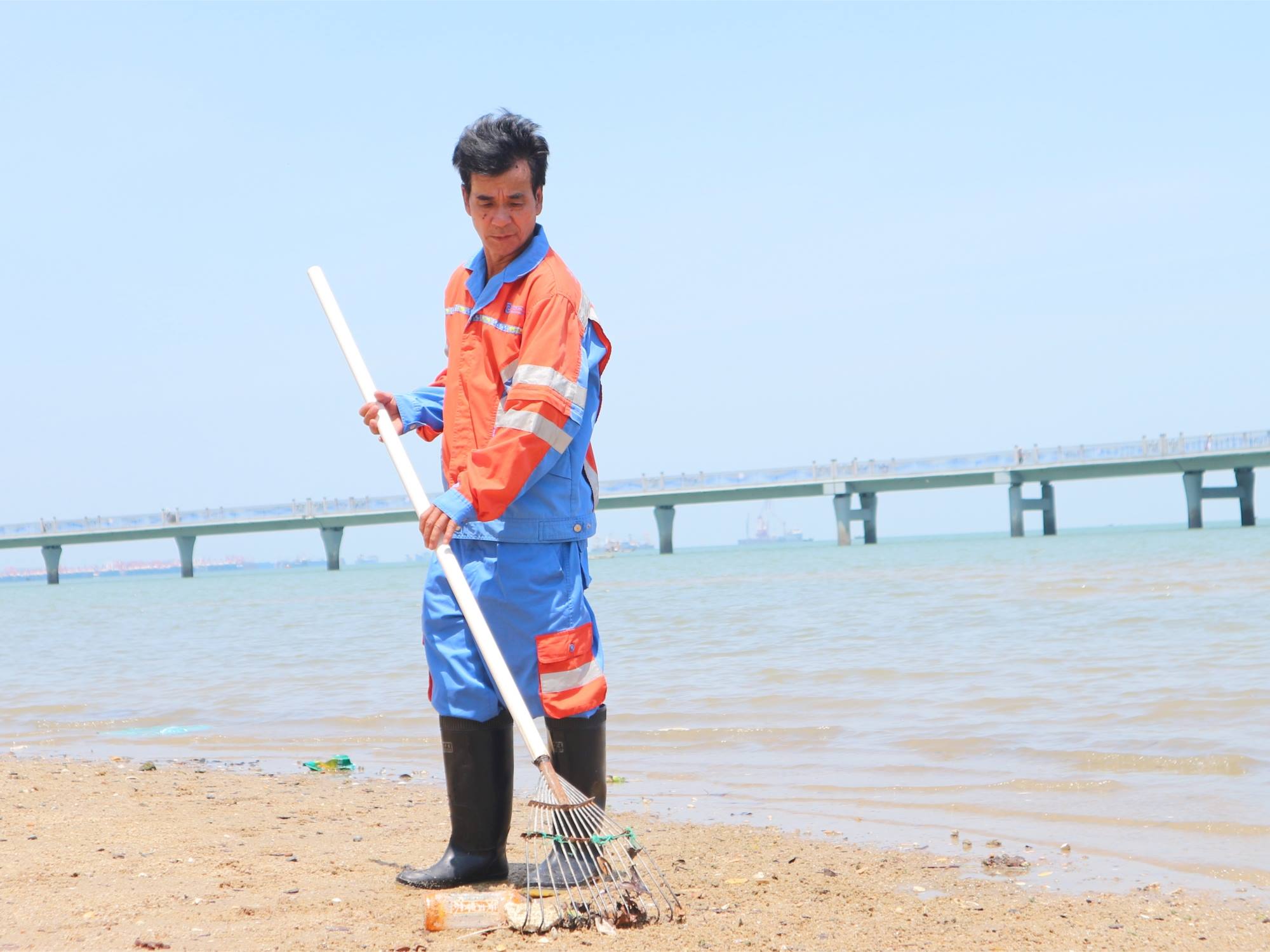 2025年5月1日上午7时许,在廉州湾大道观光桥旁,正在进行保洁工作的张德海听到“救命”呼喊声,看见一位年迈的老人陷入泥潭之中。随后,张德海利用草耙子将深陷泥潭的老人成功救出。