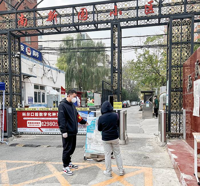 北京机扫公司职工张淼在平乐园西社区潘道庙小区对居家隔离户进行巡查服务